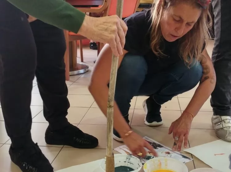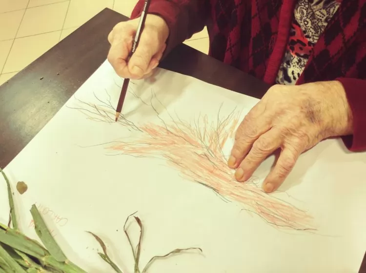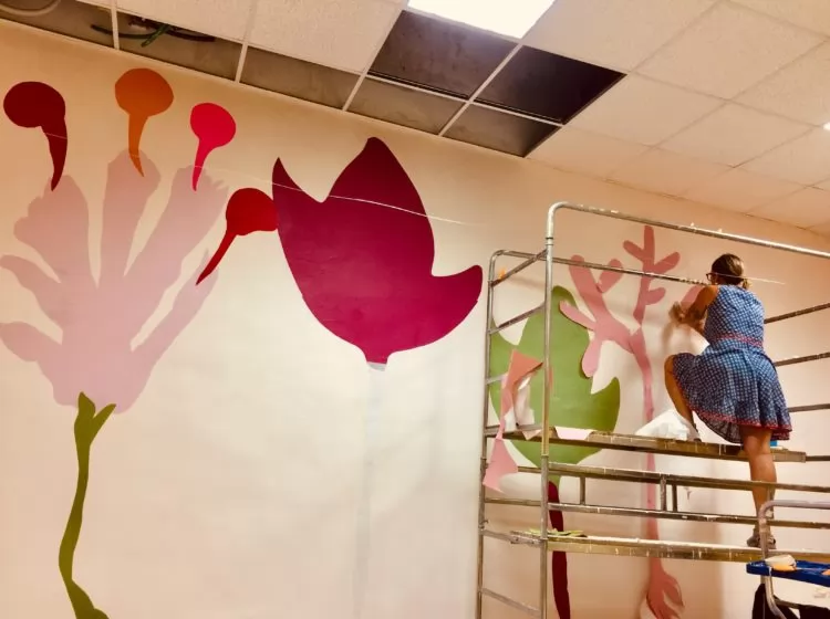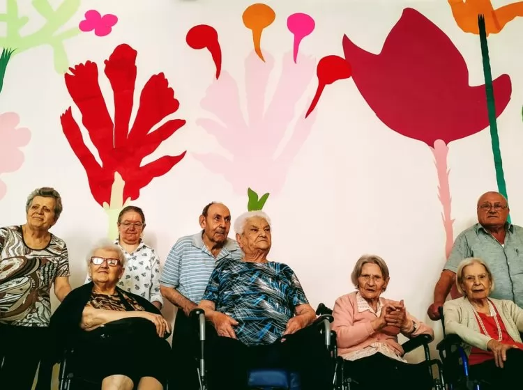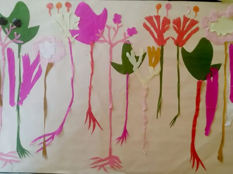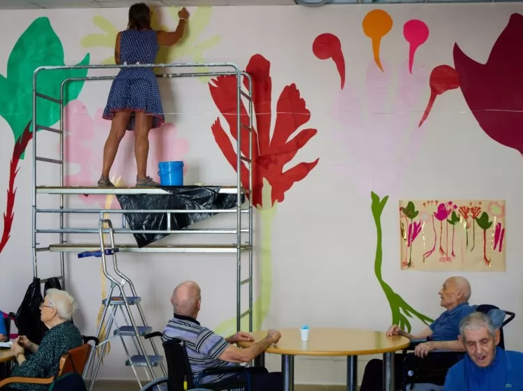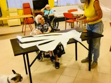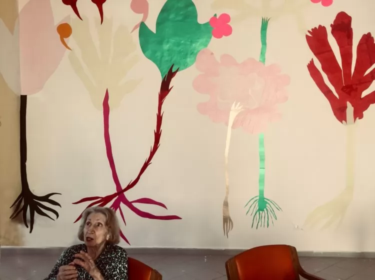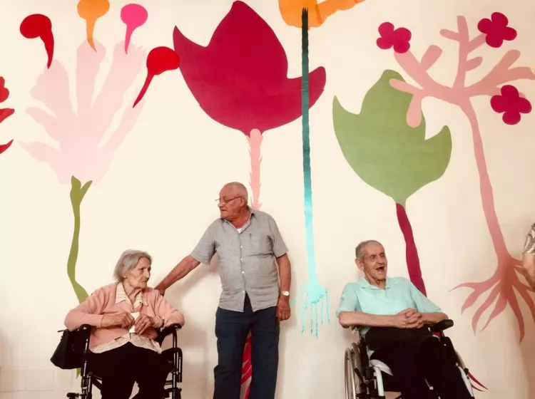 Ed è sempre sotto questa veste di esploratrice di altri posti – altre condizioni – che anche il tuo ultimo progetto alla Casa di Riposo Bambozzi viene a manifestarsi. Questa volta è il turno di anziani a diversi stadi della loro tarda esistenza, accolti in uno spazio fisico marcato come spesso accade dalla genericità – una sala d’attesa, anticamera a quello che forse sarà un nuovo giorno. Il processo e’ stato a parole semplice: immagini di un erbario tratto dalla memoria degli ospiti, riprodotti in scala sulle pareti della sala comunitaria. Linee esitanti – più per regresso che non per paura o imprecisione – dalla cima fino alle loro radici carpite, una fragilità che con la tecnica del ritaglio di carta e collage sei riuscita meglio che con la pittura a mantenere e rispettare. Li guardo come si guardano ritratti di vite, precari e monumentali, come le anime di ognuno dei loro autori originali sospesi a mezz’aria, elevati a qualcosa che “l’altro” dell’arte sa restituire, a noi tutti, accompagnandoci nel viaggio. Con sguardi, forme, gesti, colori, composizioni e sovrapposizioni, è come se raccontassi di una rinascita – diversi, degni di cura, fragili e spesso dall’aspetto quasi convalescente, ma con una forza che viene dal riconoscersi anche negli aspetti più penosi – il percorso che Joseph Beuys descrive dalla ferita all’arma.