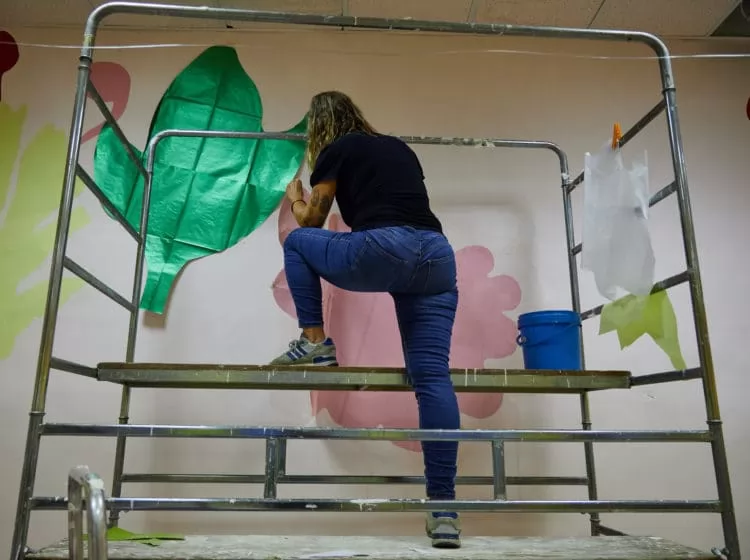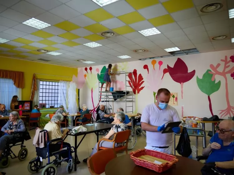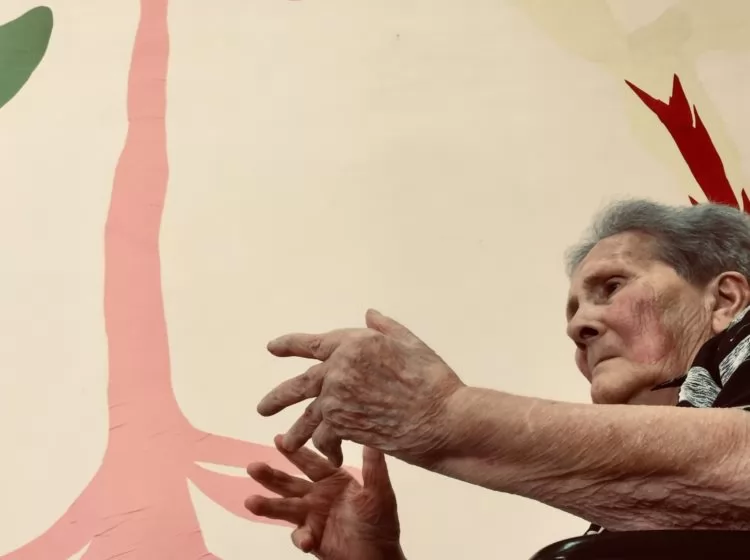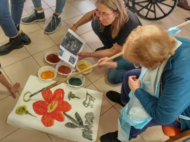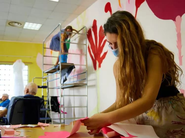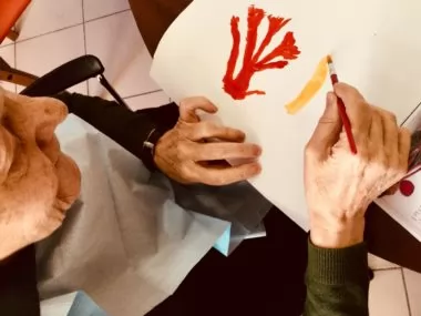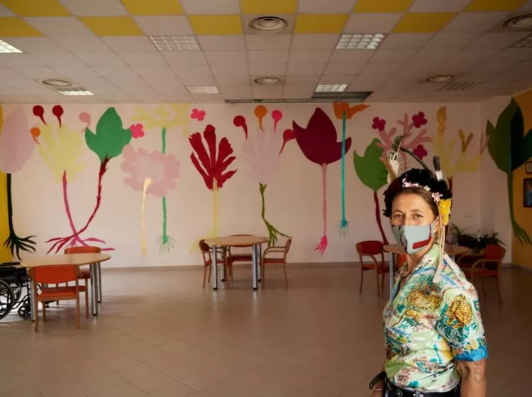 “La prima molecola” è l’opera di Allegra Corbo che nasce con il coinvolgimento degli ospiti della casa di riposo Padre Bambozzi di Osimo. Il progetto è iniziato lo scorso autunno con un workshop tenuto dall’artista, durante il quale gli anziani, alcuni ultracentenari, hanno fatto riemergere le proprie memorie “verdi” (i giardini e orti dell’infanzia, gli alberi dai quali mangiavano i frutti, i fiori dell’amato) e le hanno restituite con varie tecniche artistiche (disegno, acquerello, cut-out, stampa blockprint). Dopo il lockdown, in agosto, l’artista ha realizzato un’opera murale riproducendo quelle immagini in un collage immaginifico, un giardino visionario dove la Natura si incontra con la rimembranza. L’opera si ispira ai cut-outs di Matisse, ultimi lavori realizzati dal maestro francese quando una malattia limitò la sua mobilità fisica. L’intervento nasce da un progetto di PopUp Studio in collaborazione con l’artista e con il supporto della Fondazione Padre Bambozzi.