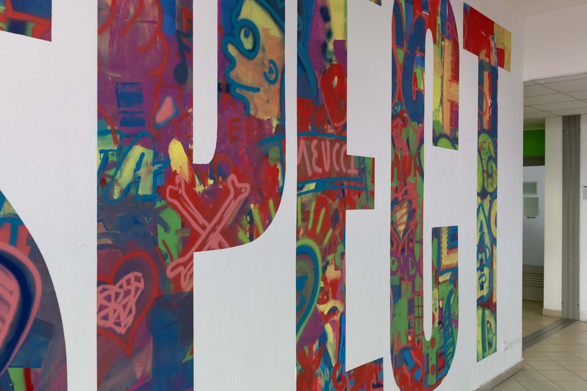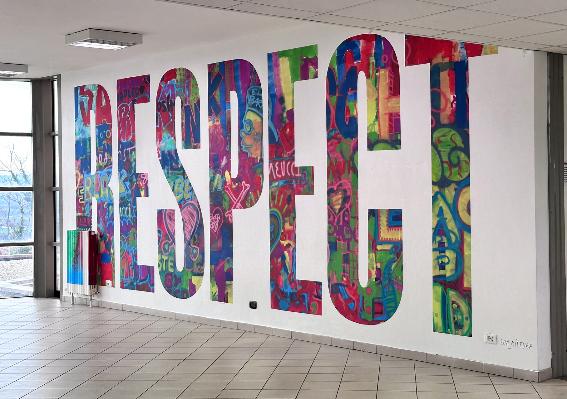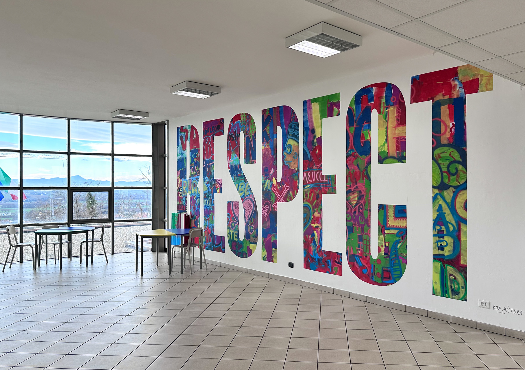 L’opera murale, rappresentata in una parete centrale, ha preso forma attraverso un lavoro di ricerca artistica basato sul concetto di simbiosi e coesistenza di elementi pittorici diversi, realizzati dai Boa Mistura con i giovani della comunità scolastica.