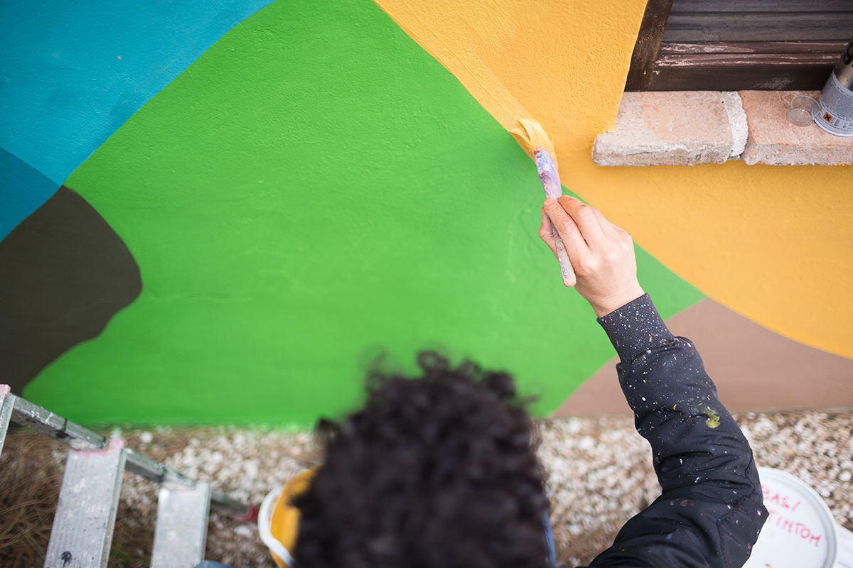 Lontano dai grandi spazi metropolitani e urbani in cui è chiamato a lavorare in tutto il mondo, Moneyless si confronta in questo caso con il paesaggio naturalistico e rurale delle Marche in un’esperienza totalizzante che nasce da un viaggio a tappe partito all’Antica Stamperia di Carpegna dove l’artista ha sperimentato per la prima volta la tecnica del blockprint realizzando un tessuto d’artista per il progetto Pop Up! Gluppa.