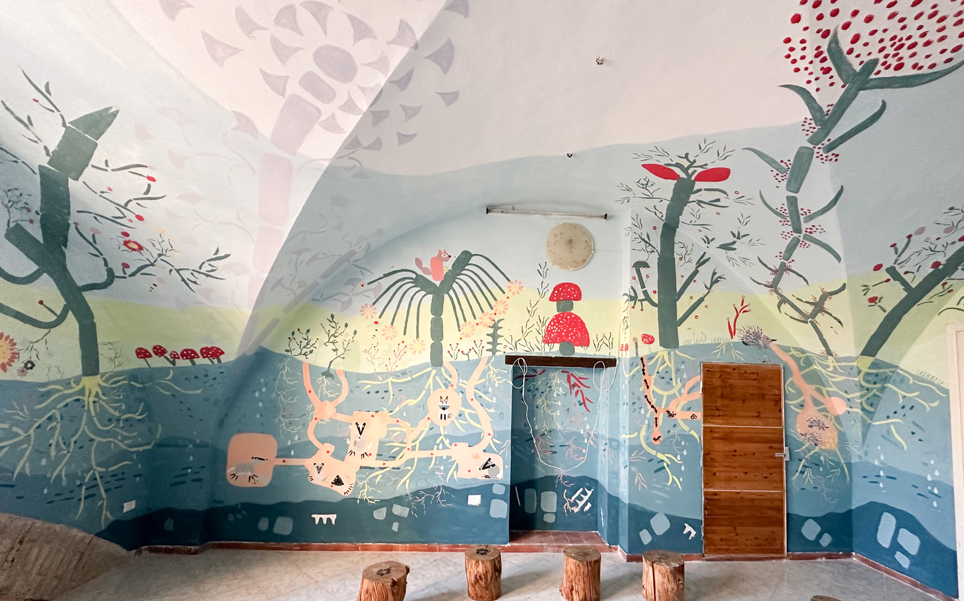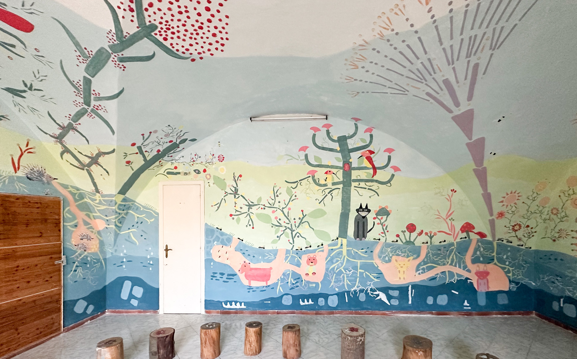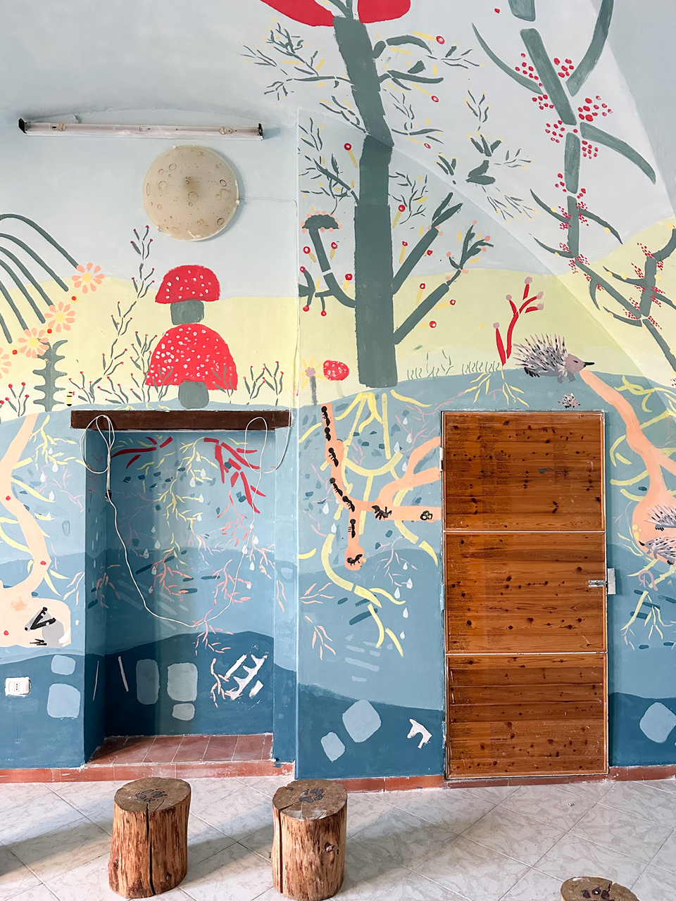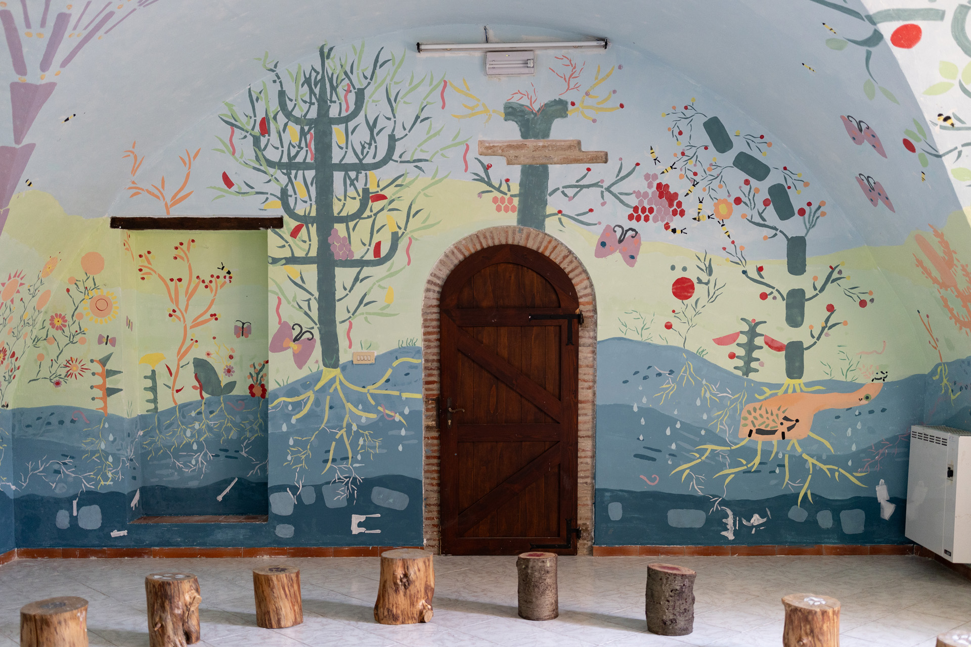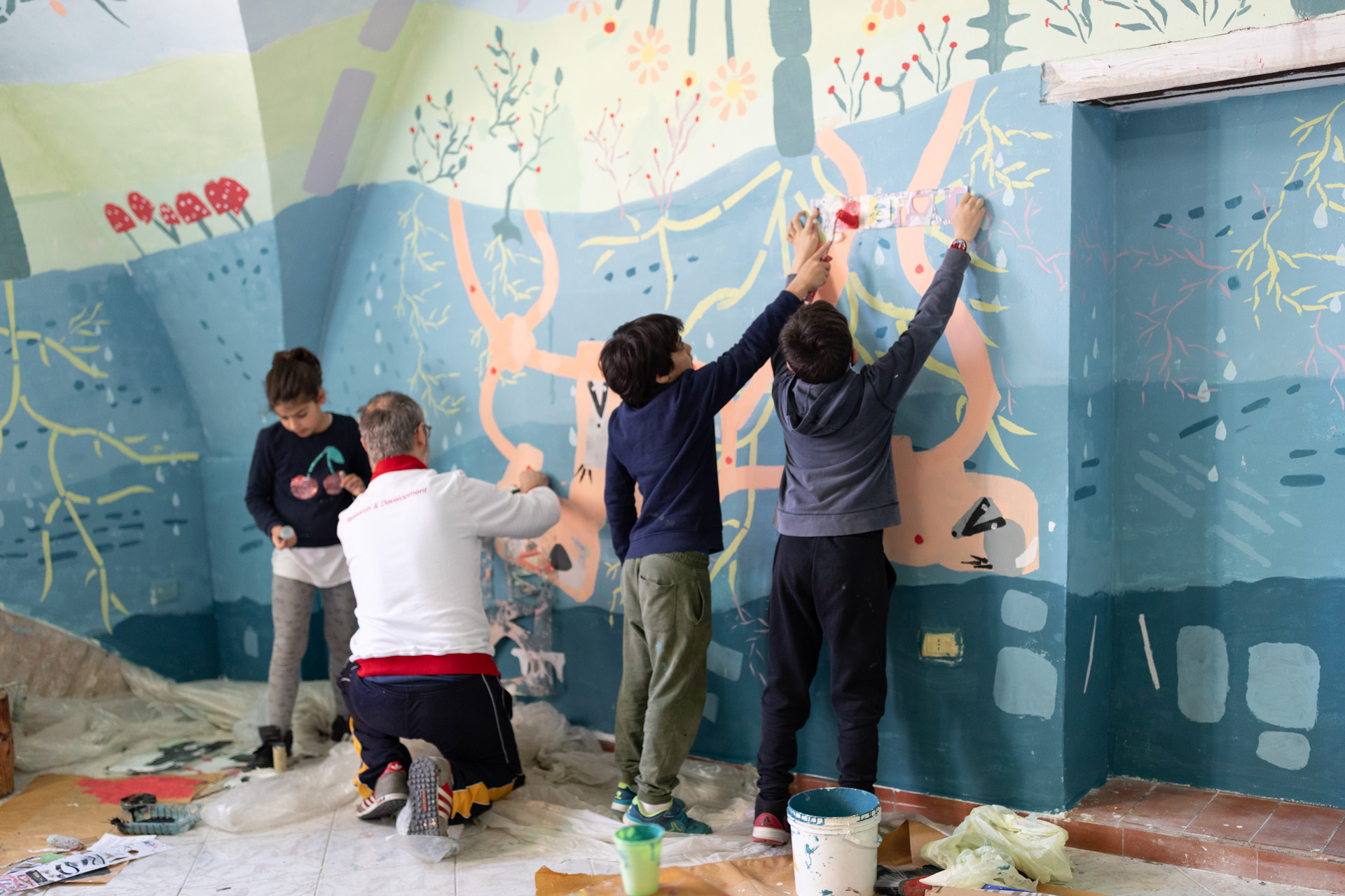 Con un approccio “relazionale” è stata trasformata la “tana” dei lupetti in un bosco murale, vibrante e inclusivo. Bambini, genitori e educatori hanno prima indossato divertenti copricapi, divenendo “alieni” che osservano la natura e le sue dinamiche. Poi, attraverso letture evocative e la creazione di stencil ispirati ai pattern naturali, hanno unito le loro diverse abilità creando un’opera collettiva.